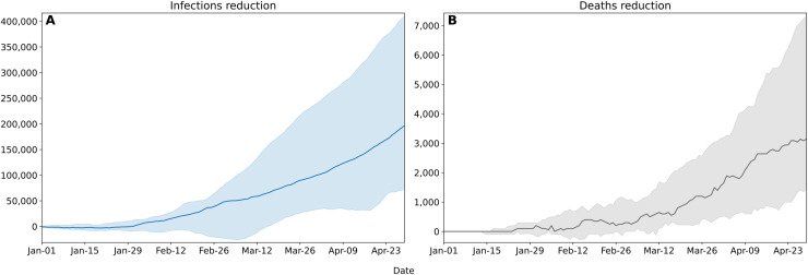 Cumulative infections (A) and deaths (B) reduction attributable to the vaccination campaign in Lombardy from January 1 to April 30, 2021. Solid lines indicate the median model across 30 simulations, shaded areas indicate the interquartile range.
