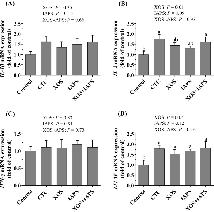 The relative mRNA expression of IL-1β (A), IL-2 (B), IFN-γ (C), and LITAF (D) in jejunal mucosa of broilers fed diets supplementation with xylo-oligosaccharides (XOS), 60Co γ-ray irradiated astragalus polysaccharides (IAPS), and their combination. The data are represented as the mean value ± SEM of each treatment. Means without a common letter significantly differ (P < 0.05). a-b Superscripts for means belong to 1-way ANOVA analyses among 5 treatment groups; P values means the significant from 2 × 2 factorial analysis (XOS and IAPS). Control, birds fed with basal diet; CTC, XOS, and IAPS, birds fed with basal diets supplementation with 50 mg/kg chlortetracycline, 100 mg/kg XOS, and 600 mg/kg IAPS, respectively; XOS + IAPS, birds fed with a basal diet supplementation with 100 mg/kg XOS and 600 mg/kg IAPS. Abbreviation: CTC, chlortetracycline.