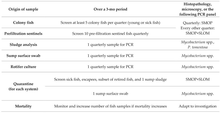 List of SMOP and SLOM for the scenario EUs. For routine screening, SMOP are tested quarterly and SLOM twice a year. In quarantine, samples are tested quarterly, at or soon after arrival of fish, and samples are screened for both SMOP and SLOM of the corresponding EUs. The list of SMOP and SLOM are particularly useful when setting panels for pathogen-specific screening (for example, PCR, mycobacterial culture, or serology). Other techniques like histopathology, microscopy, and bacterial culture allow a broader and less specific detection of pathogens and diseases and should be used as the methods of choice for clinical investigation.