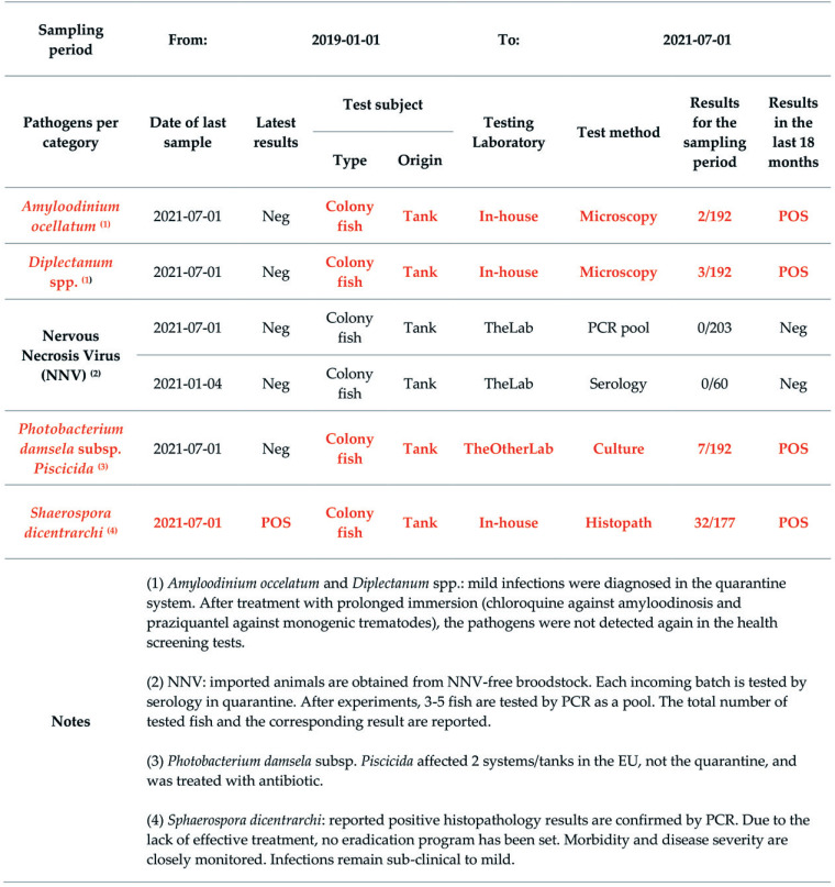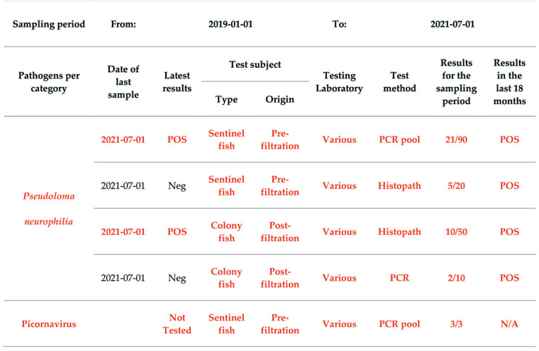 Both Rooms A and B have prefiltration sentinels placed on each system for at least 3 mo before testing. Samples from both rooms are pooled and submitted together, and the health statuses of each room are not discriminated. The health monitoring follows the recommendations in part 1 of our report (see the screening pattern in Figure 2, the list of SMOP and SLOM in Table S3 column D. rerio (isolated), and the health monitoring template Table S5 in63). Figure 2 shows the list of SMOP and SLOM, Figure 3 the screening pattern, and Figures 4, 5, and 6 some sections of the health monitoring report for scenario #1. EU1 is considered positive for P. neurophilia and picornavirus (ZfPV-1). Agents to be excluded from EU1 are the SMOP M. haemophilum, M. marinum, and P. tomentosa, and the SLOM Edwardsiella ictaluri, Flavobacterium columnare, Ichthyophthirius multifiliis, Piscinoodinium pillulare, and Pleistophora hyphessobryconis.