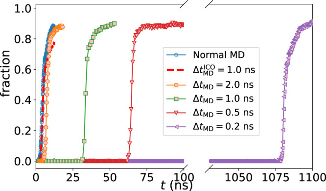 The time dependence of the fraction of the crystallised atoms is shown at different conditions. Crystallisation originally starts from 2.0 ns during isothermal annealing (Normal MD). By killing the preordering periodically every ΔtMD using the bias potential, the nucleation time has been remarkably changed. The shorter ΔtMD is, the longer time is needed for nucleation to start. In contrast, the suppression of local icosahedral ordering ( ns, dashed line) shows little influence on the incubation time of crystal nucleation. All the biased simulations start from the same condition from Normal MD.