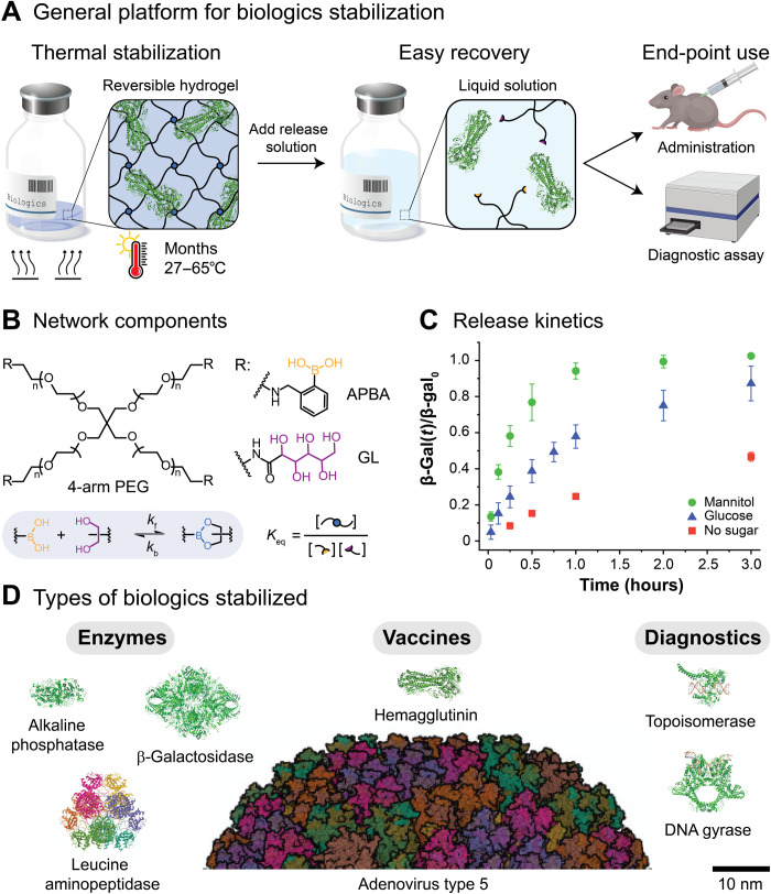 (A) The thermal stabilization platform is based on dynamic covalent boronic ester–based hydrogels, where boronic acids (yellow) and diols (purple) form reversible boronic ester cross-links (blue). After encapsulation within the reversible hydrogels, the stored biologics are protected from thermal stresses. On-demand recovery and subsequent use of the biologics are enabled by the addition of sugars, which triggers network dissolution. (B) The reversible boronic ester–based hydrogels were formed from four-arm PEG macromers (Mn ≈ 10,000 g mol−1) end-functionalized with a phenylboronic acid derivative (APBA) or a cis-1,2-diol containing moiety [gluconolactone (GL)]. (C) The fractional release of β-galactosidase over time, β-gal(t)/β-gal0, from the PEG-APBA/GL gels [7.5% (w/w)] is modulated by the addition of cis-diol containing sugars such as mannitol and glucose (100 mg ml−1, pH 7.5). The release rate depends on the magnitude of the equilibrium binding constant, Keq,D, between PEG-APBA and the added sugars (Keq,mannitol = 20 and Keq,glucose = 3) (37). (D) Reversible hydrogels are suitable for the thermal stabilization of multiple classes of biologics, including model enzymes, protein-based vaccines, whole viruses, and clinical diagnostic enzymes with sizes ranging from 10 to 100 nm. For comparison, the mesh size of the reversible hydrogels, ξ, is estimated to be 7.5 nm.