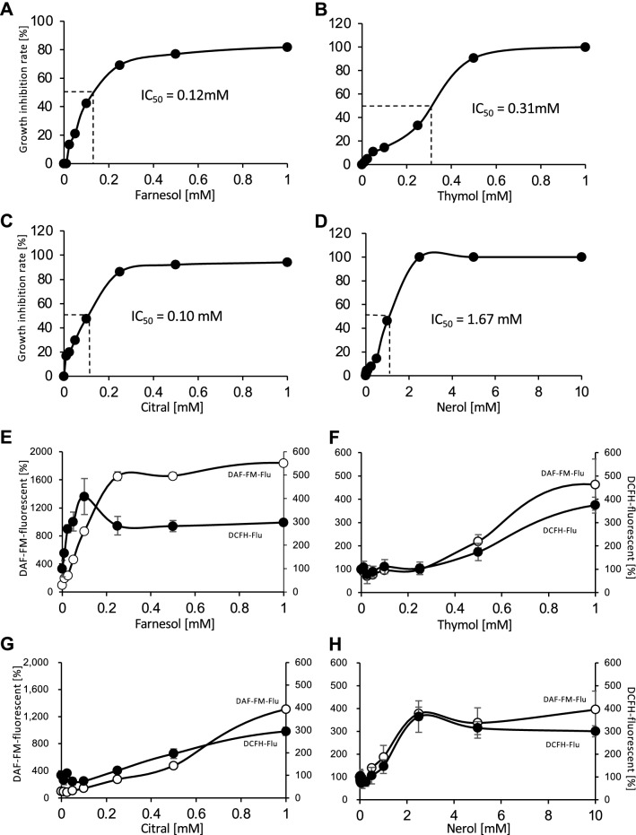Relationships between antifungal compound concentrations and the growth inhibitory effects or productions of DCFH- and DAF-FM-related fluorescence. The growth inhibition rates were determined after treatment with different concentrations of farnesol, thymol, citral, and nerol (A–D, respectively). The calculated IC50 values are depicted in the graph. The induced DCFH- and DAF-FM-related fluorescence intensity levels, shown by black and white circles, respectively, were measured after treatment with farnesol, thymol, citral, and nerol (E–H, respectively).