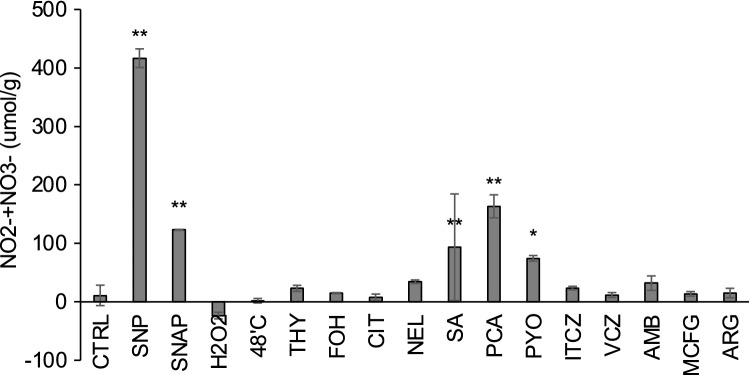 In these experiments, the intensity of DAF-FM fluorescence decreased significantly in the presence of farnesol plus tocopherol compared with farnesol alone (Fig. 4B). This result raised the question of whether the DAF-FM signal was affected by the ROS level. Another possibility was that DAF-FM fluorescence occurred in the presence of ROS but not NO. To address this question, NO homeostasis in the hyphae was investigated using the Griess method to determine the NO content. When treated with oxidative and high-temperature stresses, in contrast to our expectation, there was no significant increased level of NO production (Fig. 5). After treatment with other antifungal agents including farnesol and thymol, no significant NO production was detected, except after salicylic acid, PCA, and pyocyanin treatments (Fig. 5). Thus, NO did not appear to be produced in the A. fumigatus hyphae treated with antifungal agents.