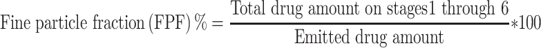 The aerosol performance of carrier-based formulations with the HandiHaler (Boehringer Ingelheim Pharmaceuticals, Inc, Ingelheim am Rhein, Germany) device was evaluated by using carrier-based formulations and an eight-stage nonviable Anderson cascade impactor (ACI) (TE-20-800, TISCH Environmental, Inc., Cleves, OH, USA) following the USP Chapter <601> specification for aerosols. A flow rate of 60 L/min was set and confirmed before each experiment using a flow meter (DFM 2000, COPLEY Scientific, Nottingham, UK). The ACI stage collection plates were coated with silicone oil to prevent particle bounce and re-entrainment during the test. Number 3 gelatin capsules were manually filled with 20 mg of each of the carrier-based formulations. A mouthpiece was mounted in the induction port, and the devices were inserted into that. The experiments were performed using a flow rate of 60 L/min for four seconds, and 20 capsules were used for each set of experiments. We quantified the amount of drug remaining in the capsules and distributed it onto the collection plate of each state using modified HPLC methods. We determined the aerodynamic cutoff diameters of each stage as 8.6 µm, 6.5 µm, 4.4 µm, 3.3 µm, 2.0 µm, 1.1 µm, 0.54 µm, and 0.25 µm for stages −1 to 6 at a flow rate of 60 L/min. The emitted dose (ED) was intended to be the percentage of the difference between the initial weight and the remaining weight of the drug in the capsule after aerosolization. The fine particle fraction (FPF) indicated the ability of the particles to reach the respirable region with an aerodynamic size of about 5.0 μm or less. The FPF is expressed as the proportion of drug amount collected at stages 1 through 6 in the ED based on the following equations (Equations 4 and 5):