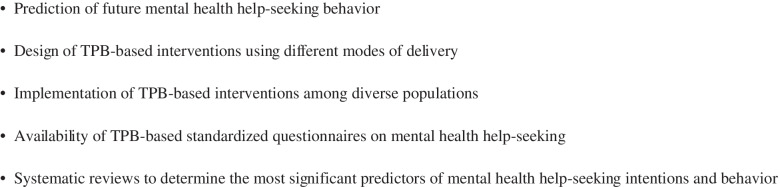 The present scoping review identified a considerable evidence base on the TPB for predicting mental health help-seeking intentions. Attitudes and perceived behavioral control were frequently found to be significant predictors of help-seeking intentions. Knowledge on the TPB for predicting mental health help-seeking behavior, and on TPB-based interventions, is limited. Thus, the role of the TPB in developing help-seeking interventions remains unclear. Recommendations are presented to address such research gaps and inform policy and practice.