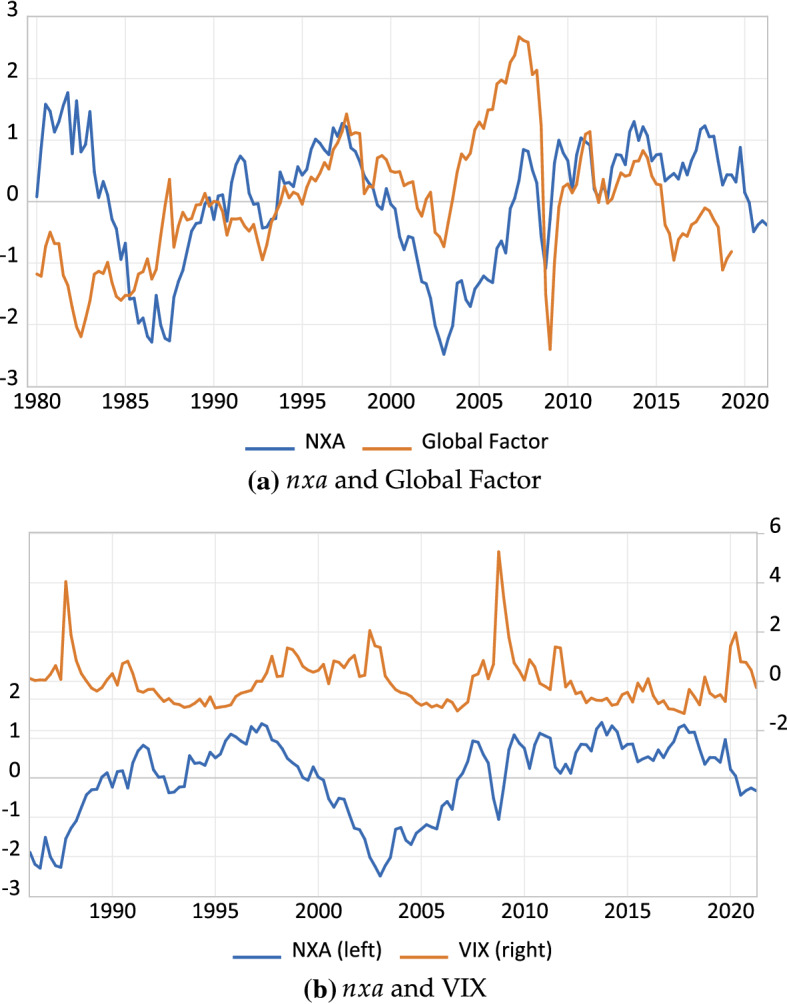 For the time being at least, it looks like the global insurance properties encoded in the US external balance sheet have remained fairly stable over time. Figure 4 plots a cyclical measure of US external imbalances, nxa, constructed by updating the methodology in Gourinchas and Rey (2007b), alongside Miranda-Agrippino and Rey (2020)’s global factor (panel a) and the VIX (panel b). nxa controls for trends in external balances that might be due to the process of trade and financial globalization. A negative value indicates that the USA is running an excessive trade deficit or is becoming more of a debtor country. The graph illustrates how, every time there is a spike in risk—at the time of the global financial crisis in 2008, of the Eurozone sovereign debt crisis of 2012, and more recently with the COVID-19 crisis—the net external position of the USA, as measured by nxa, deteriorates. In that sense, the US net external position still transfers wealth to the rest of the world in times of global stress.