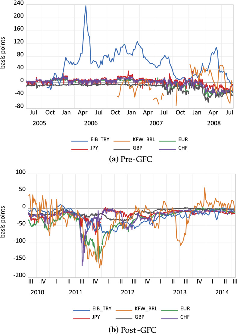 To illustrate, Fig. 5 panel (b) plots the 3-month basis for four emerging market currencies: the Korean won (KRW), the Israeli shekel (ILS), the Malaysian ringgit (MYR) and the Mexican peso (MXN). Not surprisingly, this measured spread is much larger than for advanced economies: for EMs, the basis fluctuates between basis points and 400 basis points, while for AEs, it never exceeds basis points. As indicated above, however, much of this could reflect local currency credit risk (panel (b) uses interbank rates, but these may also be reflecting local currency credit risk). Covering that credit risk is not easy to implement. For instance, sovereign credit default swaps (CDS) are usually only triggered in the event of a default on foreign currency debt, and not local currency debt. What one can do instead is to construct an estimate of the risk-less CIP deviation using the yields of supranational organizations borrowing in different currencies. In effect, this replaces and by the equivalent yields at which supranationals borrow. Because these supranational entities do not face much, if any, credit risk, the supranational basis measures the risk-free basis for that currency.