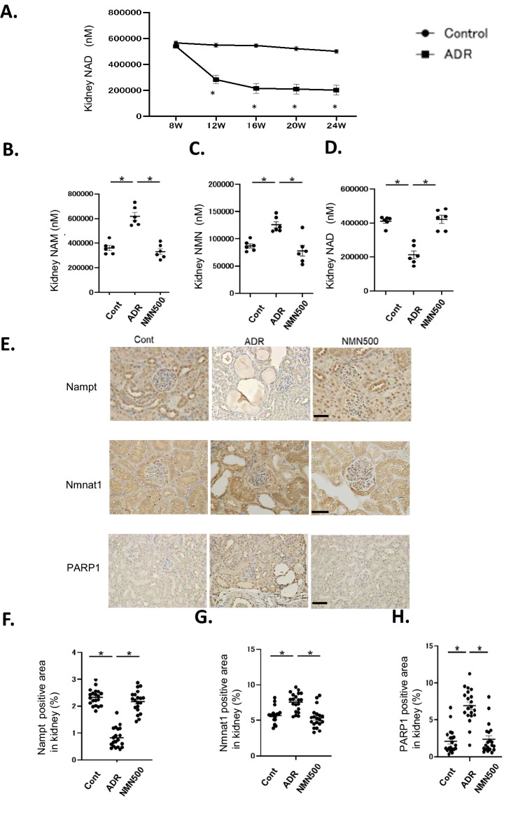 Effects of NMN treatment on NAD+ metabolites and the salvage pathway. (A) Temporal changes in NAD+ concentrations in the kidneys of mice in the Cont and ADR groups (n = 6). (B–D) Renal tissue concentrations of NAD+ metabolites, NAM (B), NMN (C), and NAD+ (D) in the salvage pathway on day 28 in the Cont, ADR, and NMN500 groups (n = 6). (E) Representative images of sections immunostained with Nampt, Nmnat1 in the kidneys of the Cont, ADR, and NMN500 groups (scale bar 50 µm). (F–H) Proportional staining areas for Nampt (F), Nmnat1 (G), and PARP1 (H) (n = 20 sections/group). All data are shown as mean ± standard error of the mean. Statistical significance between each group is represented by a horizontal bar. *P < 0.05.