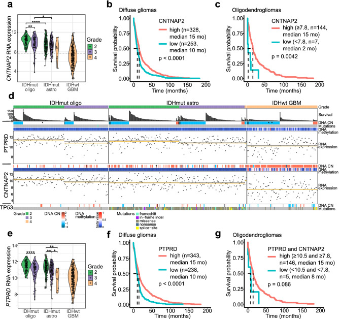 CNTNAP2 and PTPRD expression is associated with tumor aggressiveness and poorer patient survival. (a) CNTNAP2 expression in 581 diffuse glioma cases including 151 IDHmut oligodendrogliomas (oligo), 227 IDHmut astrocytomas (astro) and 203 IDHwt glioblastomas. Statistical significance was calculated between tumor grades in each subtype and between different tumor types with the same grade. *p < 0.05, **p < 0.01, and ****p < 0.0001 based on the Wilcoxon rank-sum test. Selected cutoff 7.8 for high and low expression of CNTNAP2 is marked with a dashed line. (b, c) Low CNTNAP2 expression was associated with poor overall survival in both b) the whole diffuse glioma cohort (581 cases, log-rank test) and c) within oligodendrogliomas (151 cases, log-rank test). (d) Summary of PTPRD and CNTNAP2 alterations and expression levels in diffuse glioma (482 cases with DNA methylation, DNA copy number and RNA expression data). Both DNA methylation and decreased copy number (CN) are associated with lower PTPRD expression, whereas CNTNAP2 expression was only linked to DNA methylation. Tumors harboring intragenic rearrangements of PTPRD or CNTNAP2 are indicated with an asterisk. The mean and median RNA expression are presented in yellow and gray, respectively. (e) PTPRD expression decreases by tumor grade in oligodendrogliomas and IDHmut astrocytomas but does not differ between tumor subtypes (581 cases, Wilcoxon rank sum test). Dashed line indicates the selected cutoff 10.5 for high and low expression of PTPRD. (f) Low PTPRD expression is associated with poor overall survival in diffuse gliomas (581 cases, log-rank test). (g) Low survival rates detected in oligodendroglioma patients with low expression of both PTPRD and CNTNAP2 (151 cases) using cutoffs of 7.8 for CNTNAP2 and 10.5 for PTPRD.