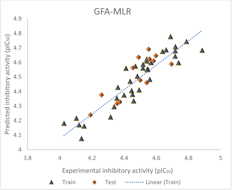 The construction of the QSAR model was established by employing the Material Studio software version 8.0. The Genetic Function Approximation (GFA) was used for the feature selection of the pretreated descriptors in the training set for model development (Abdullahi et al., 2020a), and Friedman Lack-of-Fit (LOF) was selected as the functionality while the scaled LOF smoothness parameter was set at the default of 0.5. The population sample was set to 10,000 at 1000 maximum generations and the number of top equations return was set to 1 (Umar et al., 2019). The descriptor matrix of the best-built model was initially subjected to the Y-Randomization test as a measure to attest to the quality of the model before being exported to Molegro Data Modeller (MDM) software for the development of the MLR and ANN models (Poleboyina et al., 2022). The MLR model assumes that the dependent variable (y) is a linear function of the independent variables (xi), as shown in Eq. (1).