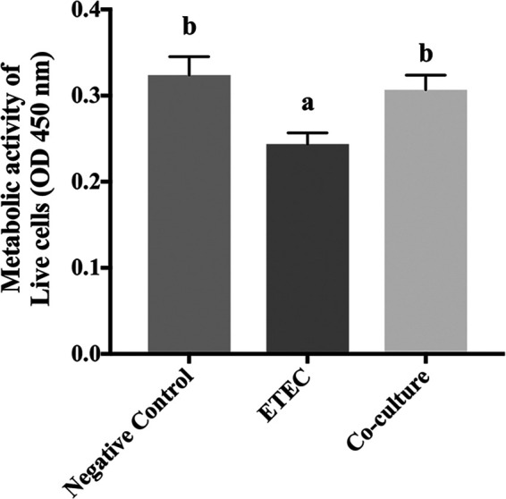 Even though probiotics have been researched and developed for use in animals and humans, mixed success has been obtained practically in combating enteric infections (5). This could be attributed to strain/species specificity, efficacy, and lack of understanding of their interactions with host cells (27–31). Recently, advancement in the molecular and mass spectrophotometric techniques has facilitated the assessment and characterization of diverse complexity in host-probiotic interaction (5). This is particularly important since metabolic influence of the probiotic microbes is largely driven by their evolutionary and ecological cues (32–36), which could directly impact host physiological functions. The metabolomic influence of probiotic bacteria on hosts remains an underexplored area of research, and assessing the metabolomic profiles of these interactions may therefore provide functional cues to the development of a host-tailored next generation of probiotics. We recently isolated a novel Bacillus subtilis strain (CP9) from sub-Saharan camel feces, characterized this strain in our lab (37), and showed that CP9 had excellent probiotic properties, including a broad-range antibacterial effect that was independent of toxin secretion (38). We also showed that CP9 caused metabolic dysregulation in ETEC. Here, we test the hypothesis that CP9 can confer cytoprotection to IPEC-J2 cells during an experimental ETEC infection in vitro. We evaluate the ability of CP9 to attenuate ETEC infection in IPEC-J2 cells by performing pre- and coincubation assays. We further characterize the mode of action of the CP9 in IPEC-J2 cells and decipher the metabolic impact that CP9 has on IPEC-J2 cells.