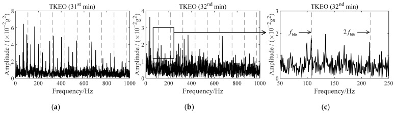 The spectrum obtained by TKEO. (a) For the signal sampled at 31st min; (b) for the signal sampled at 32nd min; (c) enlarged view of Figure A2.