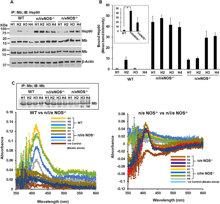 The absence or lowering of NO in NOS double (n/eNOS−/−) and (n/i/eNOS−/−) triple KOs makes the myoglobin (Mb) heme-deprived relative to wild-type controls. WT or NOS double (n/eNOS−/−) and triple (n/i/eNOS−/−) knockout mice heart supernatants were analyzed for protein expression by westerns, IPs were performed to detect the strength of Mb-hsp90 interaction which is a measure of heme-free Mb and Mb spectra the mice heart supernatants was estimated by absorption spectra collected with an integrating sphere detector (Olis Clarity), using bead bound Mb that was immunoprecipitated with Mb antibody. (A) IPs depicting Mb-hsp90 interactions in various mouse heart supernatants as indicated. Protein expression is depicted by westerns as indicated. (B) Corresponding mean cumulative densitometries of Mb-hsp90 interactions. All values depicted are mean n = 3, ±SD, *p < 0.05, by one-way ANOVA. (C) Corresponding absorption spectra of heart muscle Mb of WT, NOS double (n/eNOS−/−) and triple (n/i/eNOS−/−) KOs, collected with an integrating sphere detector. Inset shows the immunoprecipitated Mb from WT and the NOS KOs western blotted with Mb antibody.