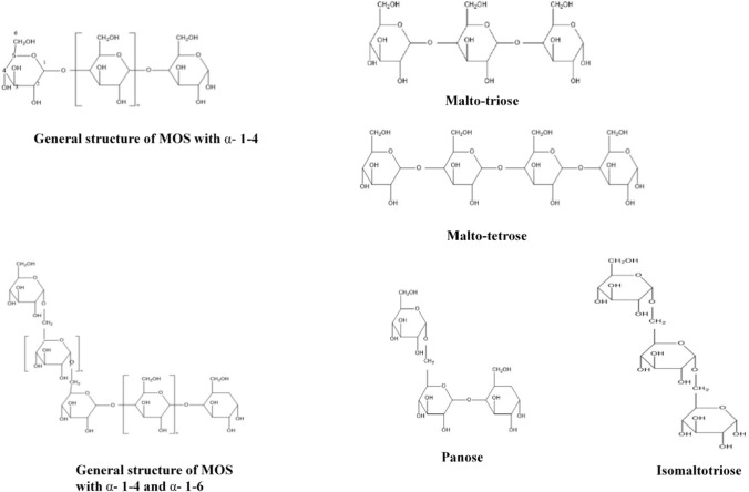 Isomaltooligosaccharide (IMOS) are non-digestible carbohydrates that consist of additional α-D-1–6 linkage. It includes isomaltose, isomaltotriose, isomaltotetrose, panose, isopanose (Fig. 1). Moreover, the definition of IMSO has been extended to α-D (1-3), nigero-oligosaccharides, or α-D (1-2), kojo-oligosaccharides. Structurally IMOS is characterized by the DP, types of linkage, and monosaccharide, and disaccharide sugar donor (Obama 2018). MOS and IMOS escape the digestive process in the gut and metabolized by intestinal microbes, thereby; promote the growth of beneficial bacteria and suppressing pathogen. The degradation of OS by microbes produces short-chain fatty acid (SCFA) which, improves intestinal function such as mineral absorption, pathogen exclusion, improved epithelial barrier function, glucose homeostasis, immune-modulation, and results in systemic effects through interaction with the specific receptor proteins (de Paulo et al. 2019; Jang et al. 2020). Similarly, a study conducted on rats showed isomaltodextrin increase colonic H2 production, protecting inflammation induced oxidative stress. Oxidative stress further cause progression of metabolic syndrome (Nishimura et al. 2016).