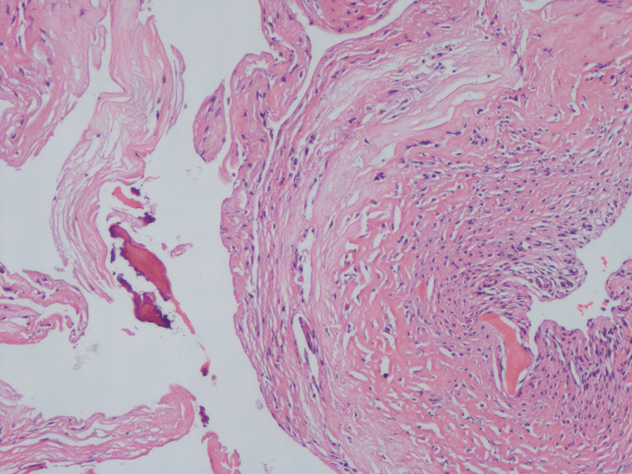 Specimens were taken intraoperatively and processed to observe the morphology and visible tissue types. Then, microscopic analyses were performed. The gross specimens showed focal wear thinning of the cartilage in the talar fornix with visible fractures and partial subchondral bone defects. Mucus-like material was found in the larger cystic lesions (Fig. 7). Microscopically, some of the bone traps were empty, osteoblasts were missing, fibroblasts were proliferating, collagen fibers were abundant, inflammatory cells were aggregating, and fibroblastic tissue was visible growing in between the necrotic bone trabeculae (Fig. 8). Folded and tortuous fibrous cyst walls were seen in intact specimens, and scattered bone-like stroma was visible between the hyperplastic granulation tissue of the cyst walls (Fig. 9). Chondrocytes and chondrogenesis with ossification were seen in the partially thickened cyst wall (Fig. 10).