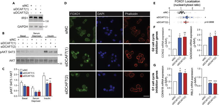 Consistent with the above, FOXO1 activation is known to reduce cell proliferation (Accili and Arden, 2004; Greer and Brunet, 2005). Among FOXO1-target genes, GADD45A, CCNG2, CDKN1B, and RBL2 are genes that promote cell cycle arrest (Greer and Brunet, 2005). The elevated expression of the G2 cell cycle inhibitory genes GADD45A and CCNG2 upon DCAF7 knockdown correlates with G2 cell cycle arrest. FOXO1 is known to exhibit stimulus-dependent changes in gene expression, inducing upregulation of select target genes (Brunet et al., 2004; Huang and Tindall, 2007; Kobayashi et al., 2005; Motta et al., 2004). Thus, the selective increases in FOXO1 target genes observed here suggest that FOXO1 is not simply activated by DCAF7 knockdown, but also fine-tuned in a target-gene-specific manner. Given that GADD45A and CCNG2 exhibited enhanced expression, we propose that DCAF7 regulates cell proliferation via interaction with IRS1 and downstream growth factor signaling to FOXO1, culminating in transcriptional regulation of cell cycle inhibitors. In support of the DCAF7-IRS1 interaction and proximal signaling being responsible for observed FOXO1 regulation, insulin-stimulated AKT phosphorylation was attenuated by DCAF7 knockdown. Thus, DCAF7 regulation of FOXO1, via upstream interactions, points to DCAF7 as a mediator of the cellular transcriptional profile.