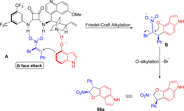 A plausible mechanism for the domino process was proposed, as illustrated in Figure 3. The cooperative double H-bonding activation of the nitrostyrene substrate through H-bonding between the squaramide moiety of the catalyst and nitro group of nitroalkene 84 and concurrent deprotonation of phenolic hydroxyl group of indole by quinuclidine nitrogen of the catalyst from the bottom face permitted the attack of incoming indole nucleophile on the activated nitrostyrene from the Si-face. The subsequent annulation through the displacement of bromine by a phenoxide anion under a thermodynamically controlled process then finally furnished the desired dihydrofuranoindoles exclusively as trans-diastereomers (Figure 3).