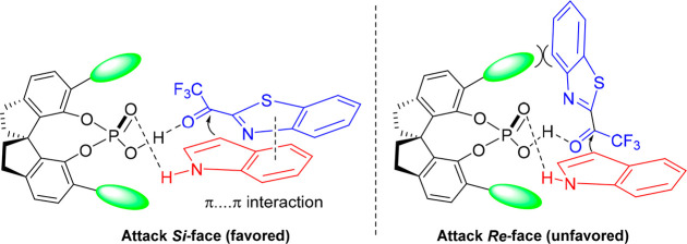 Plausible transition states for enantioselective F–C reaction of 4-aminoindoles with trifluoromethyl ketones.