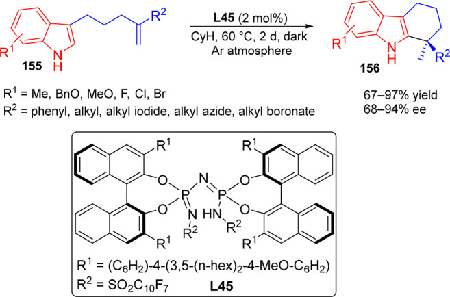 The synthesis of fused indole polycyclic skeletons has become increasingly important due to their widespread presence in many alkaloids and important organic compounds. Therefore, development of a straightforward strategy for the construction of indole polycyclic systems with skeletal and stereochemical diversity is of great significance.10c Although asymmetric F–C alkylation of indoles with alkenes has evolved as a useful technique for the asymmetric functionalization of indoles in recent years, the creation of quaternary stereogenic centers through hydroarylation of unactivated olefins remains elusive and a formidable task. Recently, List et al. developed an elegant atom-economical strategy for the organocatalytic enantioselective intramolecular hydroarylations of unactivated, electronically neutral olefins, with indoles 155.10a The unprecedented transformation of diverse olefins, catalyzed by strong and confined imidodiphosphorimidate (IDPi) Brønsted acid catalyst L45, delivered the corresponding tetrahydrocarbazoles 156 bearing quaternary stereogenic centers in high yields and excellent enantioselectivities (up to 94% ee; Scheme 29). The synthetic protocol has a broad substrate scope since alkyl boronate, an aliphatic iodide and azide, is well-tolerated and compatible, affording the corresponding hydroarylation products efficiently. Moreover, substituted indoles bearing both electron-donating and electron-withdrawing groups were well-tolerated and compatible with the catalyst system. The synthetic utility of the method was demonstrated by further transforming the hydroarylation products into bioactive molecules, without any decrease in enantiopurity.