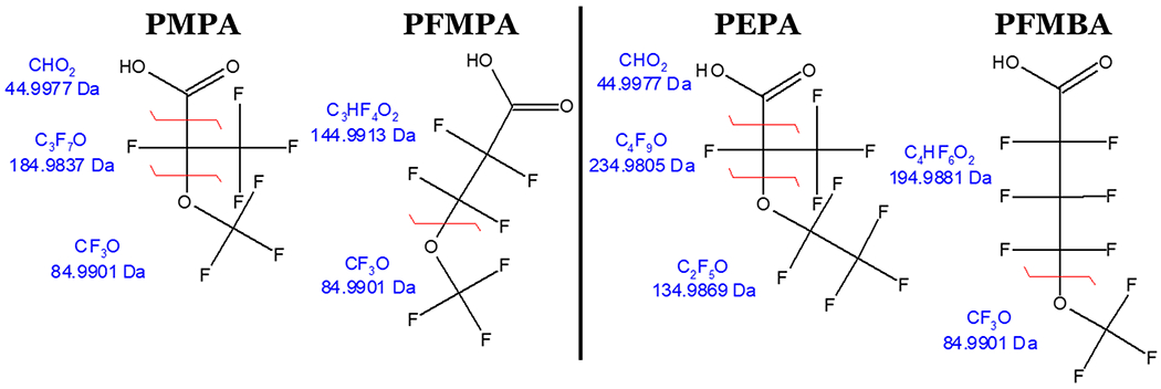 While published liquid chromatography-tandem mass spectrometry (LC-MS/MS) methods cover some of these alternative chemicals including PFMPA and PFMBA, many methods do not monitor for their branched isomers, PMPA and PEPA, respectively (see Table 1 for full chemical names, CASRNs, and structures).18–20