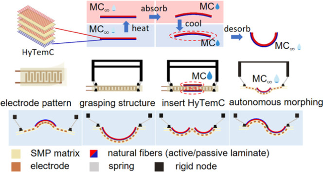 The HyTemC is formed from an unbalanced stack of natural fibers (flax) in a shape memory polymer (SMP) epoxy matrix (Figure 2a). The actuation principle is inspired by the closing and opening offered by the internal architecture of pinecone scales.41 The bioinspired fibers architecture consists of soft and high swelling ratio active layers and stiff and low hygroscopic expansion ratio passive laminas. The unbalanced microstructure of the composite material causes the bending of the composite stack due to the change of the moisture content, while the SMP matrix is sensitive to environmental temperature. Different from conventional single humidity stimulus hygromorph composites, the hygro-temperature coupled fields here create new types of bending shapes (Figure 2b). The curvatures of the HyTemCs change in different ways at room temperature and over Tg, while these composites absorb the same amount of moisture. One reason for this behavior is the different hygroscopic expansion of the active layers (2.83% at room temperature) but only 0.78% over the Tg temperature. The other reason for the numerous moisture-induced curvature changes at different temperatures is the ability of the SMP matrix to resist bending motions to reach highly curved shapes. Nearly flat shapes of the composite materials occur over Tg; the HyTemCs can therefore be heated over the Tg temperature to absorb and store specific moisture contents and cooled down to assume the preprogrammed shape. Those metasurfaces possess moisture contents (MCs) that will desorb autonomously when exposed to the working environment and will also morph into the expected shapes that correspond to the predefined curvatures at those specific MCs (Figure 2c). Via temperature, it is therefore possible to create several new sets of shapes at varying humidity conditions.