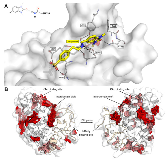 (A) Representation of compound 8 docked to the TRIM33β BRD using MOE. The docking studies suggest that the benzoimidazolone moiety of compound 8 acts as the KAc mimic and that the compound binds to the TRIM33β BRD by interacting with E981 and N1039. (B) Computational identification of cavities in the TRIM33β reader cassette. A knowledge-based cavity detection was performed using CCDC’s SuperStar package. This identified a deep cavity in the BRD, a long trench along the interdomain cleft, and a small region at the H3K4Me0 binding site, among others. There was no binding site detected in the vicinity of the H3K9Me3 binding region, consistent with its solvent-exposed nature. Figures generated using the PyMOL Molecular Graphics System, version 2.5, Schrödinger, LLC.