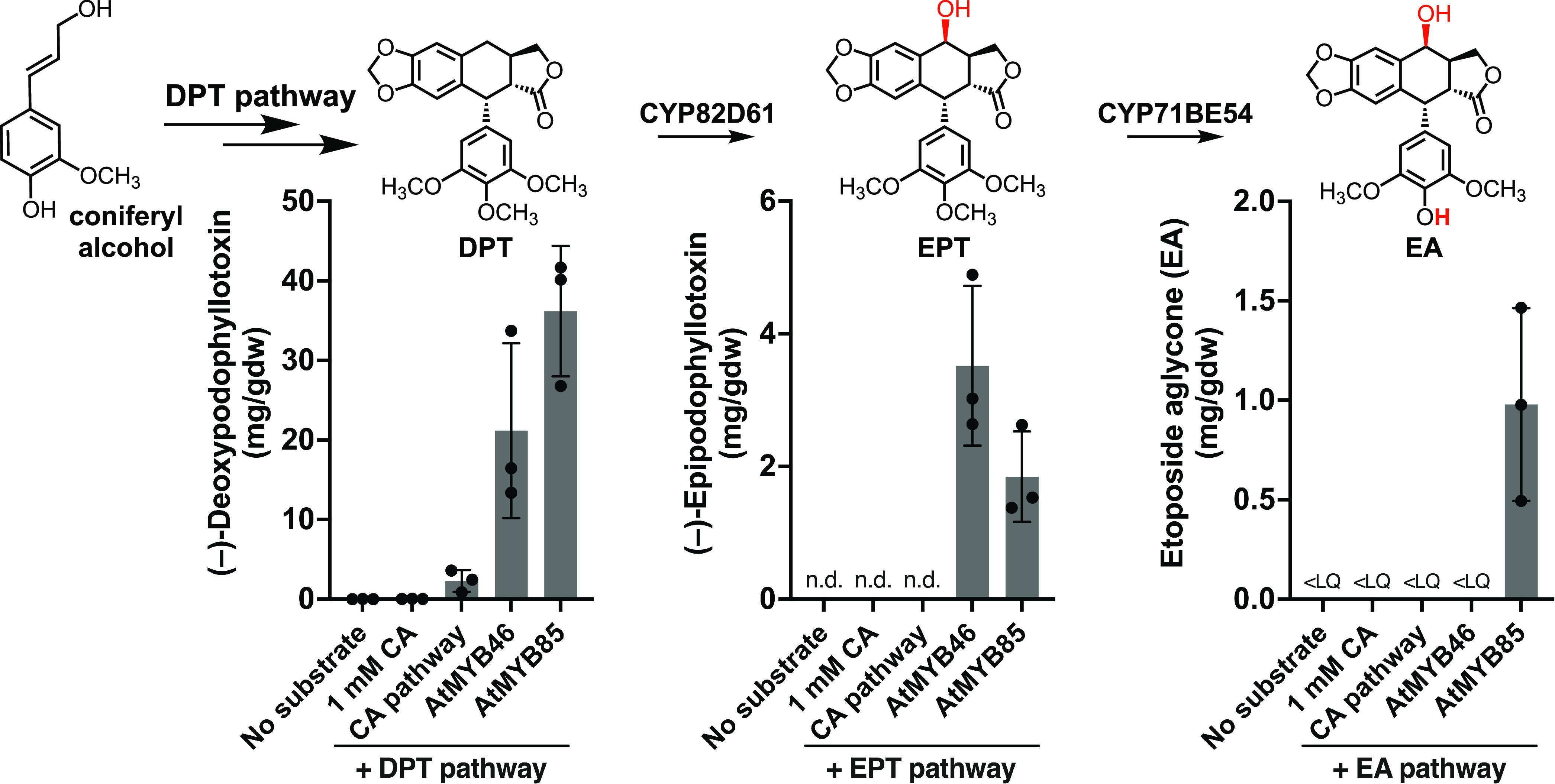 Etoposide is a clinically used chemotherapeutic and is produced from lignans found in the medicinal plant Podophyllum spp. The etoposide aglycone (EA)2 can be produced in N. benthamiana by Agrobacterium-mediated transient expression of pathway genes. However, yields are limited by the availability of coniferyl alcohol (CA), a monolignol that is also a main building block for the abundant plant biopolymer lignin. In our previous work,3 we showed that exogenous addition of CA increased yields of (−)-deoxypodophyllotoxin (DPT) in N. benthamiana leaves. By boosting CA production through overexpression of the canonical primary metabolic enzymes, we achieved milligram-level production of DPT.3 Despite these yield improvements, the levels of the lignan products were still low relative to what has been observed for lignin biosynthesis engineering (e.g., ∼30 mg/g in transgenic tobacco expressing Medicago truncatula transcription factors).12 In contrast, the high flux through the monolignol pathway required for generating large quantities of lignin suggested that the innate capacity in plant tissue for diverting fixed carbon to CA could be very high. Although CA is a ubiquitous plant metabolite, we reasoned that it is likely not present in leaves at the time of Agrobacterium-mediated DNA transfer given that (1) epidermal cells have already fully expanded, (2) lignin biosynthesis has already ceased, and (3) the leaf parenchyma does not normally contain high levels of lignin (e.g., compared to the sclerenchyma).