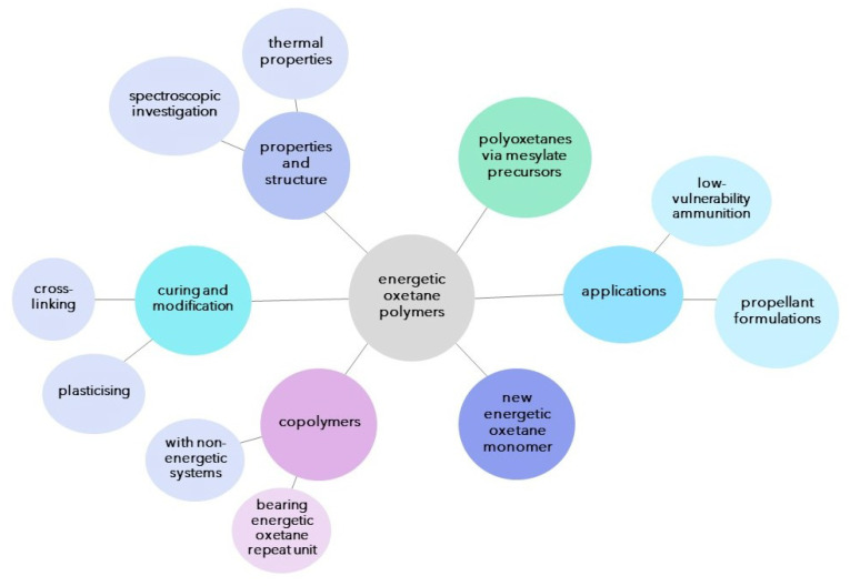 In this work, we have aimed at summarising the most relevant works on energetic polyoxetanes, discussing their synthesis, curing and most relevant properties (Figure 2). Although energetic polyoxetanes are not as diverse as GAP in their scope of application, their use as energetic binders (EBs) for composite solid propellants. Although the majority of recent reports focus on the synthesis of energetic oxetane copolymers and on modifying these systems via curing or functionalisation, a number of worthwhile efforts are also being undertaken, particularly in regards to the study of decomposition mechanisms of these EBs.