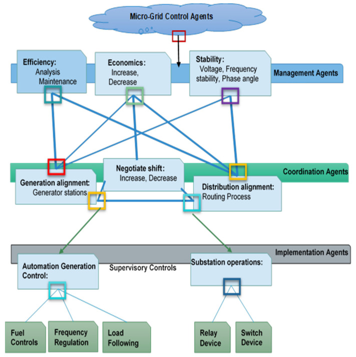 Multi-agent systems (MAS) can independently control power system operations. MAS contains several files. Intelligent creatures work together to solve problems beyond their capabilities [15]. MAS has been used in power market modeling, network protection [16], troubleshooting, and network control in recent years. The IEEE Power Engineering MAS Working Group reviewed MAS technology approaches, standards, tools, concepts, methods, and challenges in 2007.