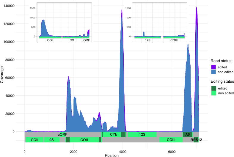 Interestingly, the abundance of cryptogene transcripts is much higher than that of the correctly encoded gene transcripts. For cryptogenes, the portion of reads with U insertions or deletions in each site over the total reads mapped on the site is quite low (Fig. 2, portion of edited reads is colored violet on the coverage plot). Among all edited regions of the coding repertoire, the 3′ end of RPS12 and the 3′ edited domains of CYb and COI include the greatest proportion of those reads that are edited. We did note some low abundance expression peaks in loci characterized as unedited that include mapped reads with U insertions and deletions, such as one in 12S. These reads likely originate from other (probably non-maxicircle) genomic loci that share sequence similarity with these maxicircle loci. This ‘read multimapping’ effect is commonly observed in low-complexity genomic regions such as the AT-rich region of 12S, and in our case, 2 non-T mismatches per read alignment are permitted.