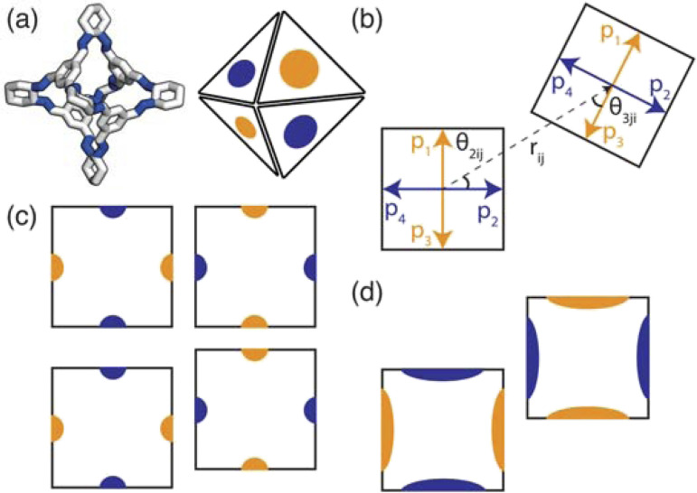 Fig. 3. (a) How the POC CC3 relates to the coarse-grained model where the orange and blue patches represent the different chemical nature of the POC's facets (i.e. window or arene face). Here the carbon/nitrogen atoms are shown in white/blue and the hydrogens atoms are omitted for clarity. (b–d) Two-dimensional representation of the patchy particle model used. (b) A representation of the geometry of the interaction between two particles for a window-to-arene simulation. Here each of the particles have four patches described by the patch vectors pα and pβ where α and β refer to patch α(β) on atom i(j). In the particular case shown in the figure, patch 2 on particle i interacts with patch 3 on particle j as they are the closest patches to the interparticle vector, rij. To relate the patches to our model we have coloured the patch vectors according to the types of patches. (c) Top: an example of the lowest energy orientation of an interaction with preferred alignment of opposing patches. Bottom: the maximum displacement between the two particles that is likely to occur with a small patch width (small σang). (d) The maximum displacement between the two particles that is likely to occur with a large patch width (large σang) leading to the formation of more ordered structures when σang is small than for larger values of σang.