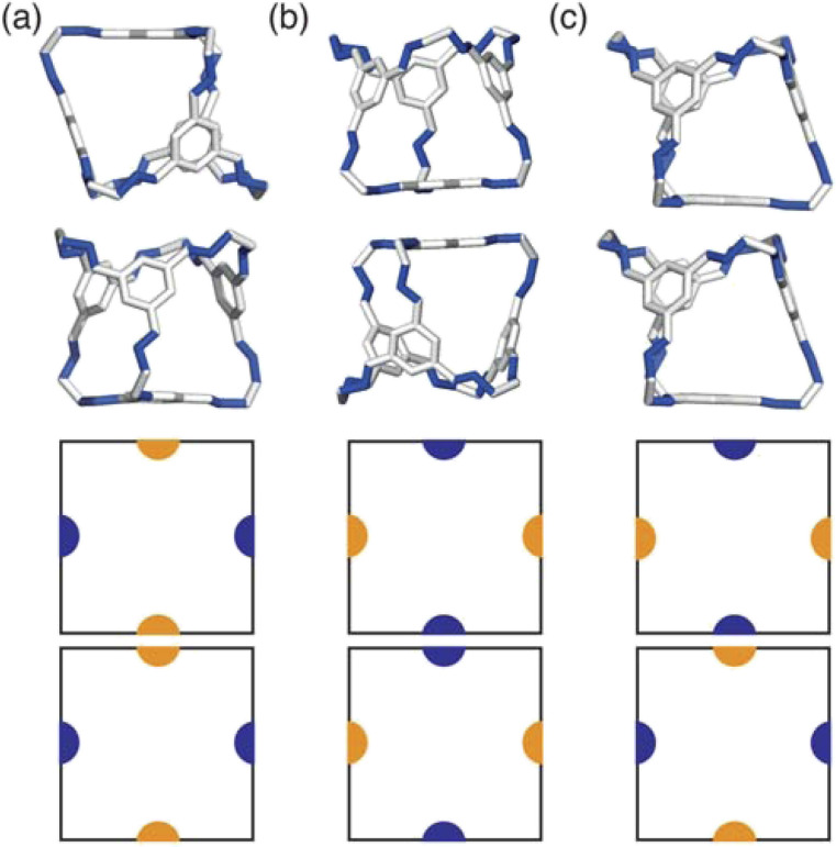 Fig. 4. Different packing types in the simulations; (a) window-to-window, (b) arene-to-arene, and (c) window-to-arene with the corresponding favourable patchy interactions shown below in 2D. The configurations are shown with the cage CC1 for simplicity, but in reality any of the cages could be substituted into these configurations.