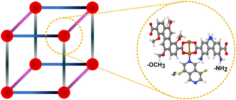 Fig. 1. Typical structures of MTV-MOFs probed (left) and a section of a representative MTV-MOF having three different functionalities (right) (different colourings of linkers on the left designate different linkers which may have different functional groups. Atom colouring: gray: C, red: O, brown: Cu, green: F, white: H, blue: N).