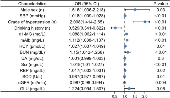 Univariate logistic analysis. SBP Systolic blood pressure, α1-MG ɑ1-microglobin, mAlb Urinary microalbumin, HCY Homocysteine, BUN Blood urea, UA Blood uric acid, Scr Serum creatinine, RBP Retinol-binding protein, SOD Superoxide dismutase, Egfr Estimation of the glomerular filtration rate, GLU Blood glucose.