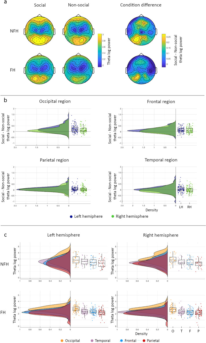 There were significant interactions between Condition and Region (p < .0001, ηp2 = .288); Condition and Hemisphere (p = .002, ηp2 = .091); Condition, Region, and Hemisphere (p = .037, ηp2 = .030); and Region, Hemisphere and Group (p = .026, ηp2 = .031). Briefly, condition effects were largest over occipital regions (p < .0001, ηp2 = .346), then frontal (p < .0001, ηp2 = .275), then parietal (social > non-social, p < .0001, ηp2 = .119), and not significant over temporal regions (p = .454, ηp2 = .006, Fig. 2b). Greater condition differences over left versus right hemisphere were seen over occipital regions (p < .0001, ηp2 = .176) but not parietal (p = .054, ηp2 = .037), temporal (p = .071, ηp2 = .032) or frontal regions (p = .917, ηp2 = 0). Follow-up tests of interactions between Region, Hemisphere and Group did not reveal clear patterns but suggested different topographies of overall theta power by group with greater lateralisation in the FH (p = .003, ηp2 = .112) than the NFH group (p = .320, ηp2 = .040, Fig. 2c, also see SI1 section. 1.1 for more details).