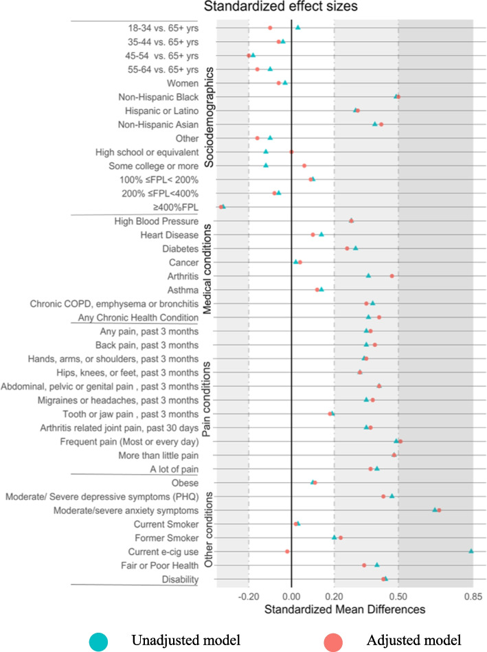Love plot displaying unadjusted and adjusted effect sizes of 31 characteristics between US military veterans with past-year VA care and veterans without past-year VA care in the National Health Interview Survey (NHIS), 2019. Logistic models were used to generate unadjusted predicted marginal prevalences and adjusted predicted marginal prevalences, standardized to the distribution of sociodemographic characteristics of the sample. Regressions adjusted for age category, gender, race/ethnicity, education, and poverty status based on Federal Poverty Level. The unstandardized regression coefficients and pooled variance from the unadjusted and adjusted regression models were then used to calculate the Cohen’s d