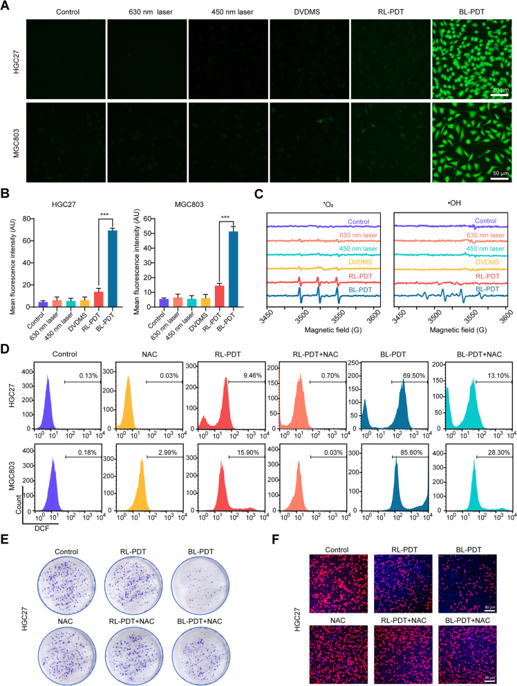 Next, we aimed to determine the PDT effects of the novel 450-nm laser (BL) combined DVDMS on GC. As clearly seen in Fig. 2A, PDT significantly inhibited GC cell proliferation in a DVDMS dose-dependent manner, and the proliferation of GES-1 cells was not significantly inhibited by PDT. And DVDMS at the same concentration alone without irradiation did not show obvious cytotoxicity in any cell line. According to the cell viability assay data, the IC50 of each cell line was calculated and used in subsequent experiments (HGC27: 0.13 μM; MGC803: 0.12 μM; AGS: 0.084 μM). Of note, a combination of BL and DVDMS showed better PDT effects than traditional 630 nm (RL) and 5-ALA under the same conditions (Fig. 2B and Additional file 1: Fig. S1C). Morphologically, more obvious changes, such as condensed chromatin and nuclear fragmentation, were observed in the BL-PDT group than in the RL-PDT group, while no visible changes were found in the control, laser, or DVDMS alone groups (Fig. 2C). The strong anti-proliferative effects of BL-PDT on GC cells were further confirmed by colony formation test and EdU assay (Fig. 2D, E and Additional file 1: Fig. S1D-F). Interestingly, the proliferation ability of normal gastric mucosal was not affected by any type of PDT (Fig. 2D, E and Additional file 1: Fig. S1D-F).