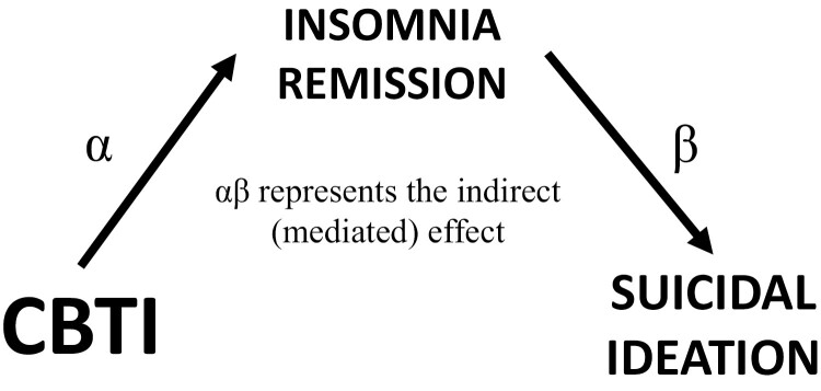 Hypothesized mediation model wherein cognitive-behavioral therapy for insomnia (CBTI) effects on suicidal ideation (SI) are mediated by insomnia remission. α represents the effect of treatment on the mediator (IV → M). β represents the effect of the mediator on the outcome (M → DV) while controlling for the effects of treatment. The product of these parameters (αβ) represents the indirect effect of treatment on the outcome through the mediator (IV → M → DV). If the 95% CI of αβ does not overlap with zero, then mediation is inferred.