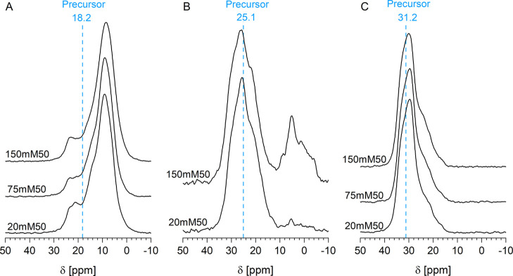 31P CP-MAS spectra of Hombikat grafted with AMPA (A), 3APPA (B), and 6AHPA (C) at concentrations of 20, 75, and 150 mM at 50 °C. The main position of the pure amino-alkylphosphonic acid precursor is indicated with a blue dotted line.