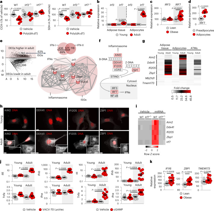The increase in the expression of this IRF7-associated gene network was confined to adipocytes (Fig. 2g) and was lacking in other cell types and organs that we tested (Extended Data Fig. 2i–k). Consistently, the AIM2, DDX41, IFI205 and ZBP1 proteins were minimally expressed in young adipocytes (Fig. 2h). In turn, AIM2, DDX41, IFI205 and ZBP1 were present in the perinuclear region and in the cytoplasm of adult adipocytes, coherent with their known role in monitoring specific subcellular compartments (Fig. 2h)45,47. Induced transcription of Aim2, Ddx41, Zbp1, Ifi205 and Irf7 was dependent on IRF7 (Fig. 2i), and coherently, the promoter regions of these genes contained IRF7-binding sequences (Extended Data Fig. 2l). The levels of IRF7-associated ISG-encoding transcripts, including IFI16, ZBP1 and TMEM173 (STING1), were increased in the adipose tissue of children with obesity (Fig. 2k), reflecting their elevated IRF7 levels (Fig. 2c).