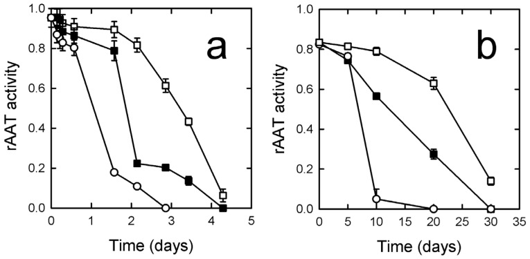 To identify the mechanism of the observed activity loss of rAAT when stored at room temperature, we assessed by LC-MS the modifications of Met358 and Met351, which are known to oxidize irreversibly to form methionine sulfoxide [41,42]. rAAT stored under different conditions was digested with trypsin, and the peptide KGTEAAGAMFLEAIPMSIPPEVKF, which contains both Met358 and Met351, was monitored by LC-MS. A molecular weight of 2259.03 Da was observed for the freshly prepared protein. rAAT incubated in PBS for 7 days at 25 °C exhibited the peptide in the non-oxidized form (2259.03 Da), in a mono-oxidized form (+16 Da), and in a di-oxidized form (+32 Da), whose AUCs in the chromatogram accounted for 57.4%, 34.3%, and 8.3% of the total signal, respectively (Figure S3 in Supplementary Material). Therefore, the slow activity loss could be attributed to the progressive mono- and di-oxidation of Met358 and Met351.
