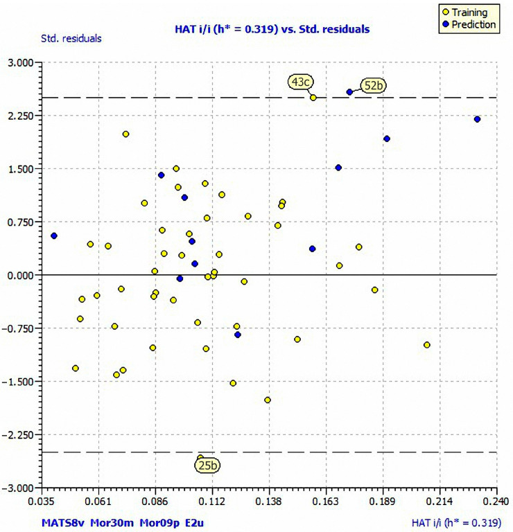 The 3D structures were optimized using molecular mechanics force fields (MM+) [58] using the HyperChem 8.0 (HyperCube, Inc., Gainesville, FL, USA). Subsequently, all structures were submitted to geometry optimization using the semi-empirical AM1 method [59]. The 2D and 3D molecular descriptors used in this study were calculated using ADMEWORKS ModelBuilder 7.9.1.0 (Fujitsu Kyushu Systems Limited, Fukuoka, Japan). Employing the QSARINS-Chem 2.2.1 (University of Insubria, Varese, Italy) [60], descriptors with a constant value for more than 80%, and descriptors that were too inter-correlated (>70%) were excluded. The final number of descriptors selected for the generation of models was 455. Generation of QSAR models was obtained by the Genetic Algorithm (GA) using QSARINS. The models were assessed by fitting criteria; internal cross-validation using the leave-one out (LOO) method; and external validation. The robustness of QSAR models was tested by the Y-randomisation test. Investigation of the applicability domain of the prediction model was performed by Williams plots (plotting residuals vs. leverage of training compounds) in order to identify the outliers and influential chemicals. The predicted data for chemicals with leverage values higher than the warning leverage (h*) must be considered with caution. The warning leverage h* is defined as 3p′/n, where n is the number of training compounds and p′ is the number of model parameters [43].