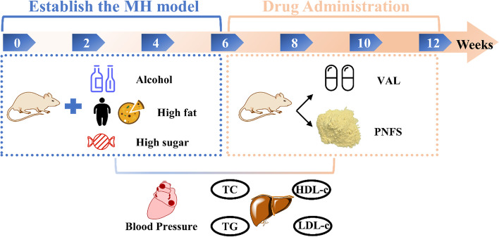Sixty male Sprague Dawley rats, weighing 180–220 g, were maintained on a standard laboratory diet and exposed to a 12-hour/12-hour light-dark cycle at 23 ± 2 ℃ (Zhejiang Academy of Medical Sciences, animal certification number: No. 2,005,190,007). All rats were allowed to eat standard food and drink water freely for one week before using for the experiment. Ten rats were randomly selected as the normal control group (NC) according to the random number table. The remaining rats were used for modeling and were fed ACHFSDs, which consisted of high-fat/high-sugar feed (TROPHIC Animal Feed High-Tech Co. Ltd) and alcohol (In the first week, the alcohol concentration was gradually increased from 5 to 10%. In the next 5 weeks, the alcohol concentration was increased by 2% per week until 20%.). The composition of the MH diet in this study was 20.0% sucrose, 15% lard, 0.8% cholesterol, 0.2% sodium cholate, and 64% standard diet. The type of alcohol is commercially available 52° Chinese Baijiu (Red Star Company, Beijing, China). During this time we tested blood pressure, TG, TC, LDL-c, and HDL-c. Approximately 6 weeks later, 46 rats with a systolic blood pressure higher than 140 mmHg were randomly divided into the model control group (MC, pure water, n = 10), Valsartan group (VAL, 8.0 mg/kg, n = 9), PNFS low dose group (PNFS-L, 30.0 mg/kg, n = 9), PNFS middle dose group (PNFS-M, 60.0 mg/kg, n = 9), and PNFS high dose group (PNFS-H, 120.0 mg/kg, n = 9) via oral daily gavage for six weeks (the entire extract of PNFS). Observe the animals’ body condition daily to ensure the animals’ health during the experiment. Animal protocols were approved by the Zhejiang Chinese Medical University of Science Animal Care and Welfare Committee (permit number: ZSLL-2017-185). The experimental design is shown in Fig. 2.