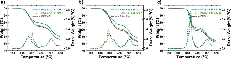 TGA traces and corresponding derivative curves of (a) PXTMA, (b) PXmPip, and (c) PXQui AEMs before and after alkaline treatment during 720 h, recorded in a N2 atmosphere at a heating rate of 10 °C min–1.