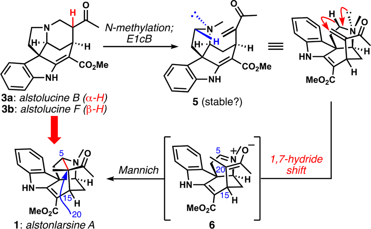 Proposed biogenesis of alstonlarsine A from alstolucines B or F