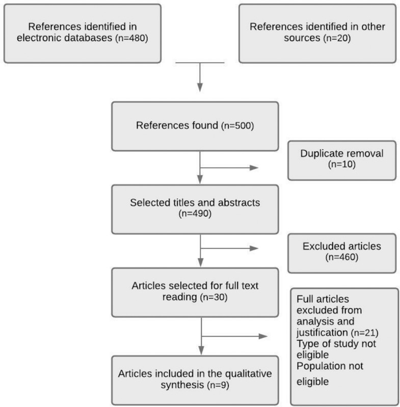 According to the flowchart presented in Figure 1, the search in databases and other sources resulted in approximately 500 articles, of which 50 addressed the subject defined in the guiding question. After eliminating duplicates and reading the titles and abstracts, 30 articles were selected for a complete reading. Of the articles read, nine were selected for qualitative synthesis (Table 1).