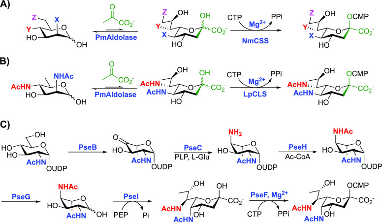 (A) OPME synthesis of CMP-Neu5Ac derivatives from ManNAc derivatives using P. multocida sialic acid aldolase (PmAldolase) and N. meningitidis CMP-sialic acid synthetase (NmCSS). X = NHAc, N3, NHGc, NHAcN3, NHAcF, or NHDAz; Y = NHAc, N3, F, or OH; Z = OH, NHAc, or N3. (B) OPME synthesis of CMP-Leg5Ac7Ac from 6-deoxy Man2Ac6Ac using P. multocida sialic acid aldolase (PmAldolase) and L. pneumophila CMP-5,7-di-N-acetyllegionaminic acid synthetase (LpCLS). (C) Biosynthetic pathway to CMP-Pse5Ac7Ac from UDP-GlcNAc using PseB (UDP-GlcNAc 4,6-dehydratase), PseC (UDP-4-amino-4,6-dideoxy-N-acetyl-β-l-altrosamine transaminase), PseH (UDP-4-amino-4,6-dideoxy-N-acetyl-β-l-altrosamine-N-acetyl transferase), PseG (UDP-2,4-diacetamido-2,4,6-trideoxy-β-l-altropyranose hydrolase), PseI (pseudaminic acid synthase) and PseF (pseudaminic acid cytidylyltransferase) from A. cavaie and C. jejuni.99,100