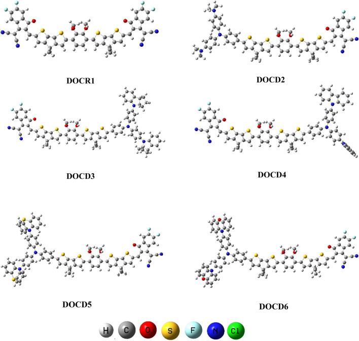 In this paper, a non-covalently fused closed-chain electron acceptor is taken as a parent molecule that belongs to a class of NF. The IUPAC name of the parent compound is 2-((Z)-2-((6-(4-(6-((Z)-(1-(dicyanomethylene)-5,6-difluoro-3-oxo-1H-inden-2(3H)-ylidene)methyl)-4,4-bis(2-ethylhexyl)-4H-cyclopenta[1,2-b:5,4-b′]dithiophen-2-yl)-2,3-bis(hexyloxy)phenyl)-4-(5,7-diethylundecan-6-yl)-4H-cyclopenta[1,2-b:5,4-b′]dithiophen-2-yl)methylene)-5,6-difluoro-3-oxo-2,3-dihydro-1H-inden-1-ylidene)malononitrile abbreviated as o-DOC6-2F28. It is simplified by a few side-chain modifications (replacing long-chain groups with a methyl group to reduce the computational cost) into a new molecule which is taken as a reference compound and coded as DOCR1 (Fig. 1). The DOCR1 possess an A–π–A configuration with the same acceptor (A) present at both ends, which are named as 2-(5,6-difluoro-2-methylene-3-oxo-2,3-dihydro-1H-inden-1-ylidene)malononitrile while, the π-spacer is named as 2-(4-(4,4-dimethyl-4H-cyclopenta[1,2-b:5,4-b′]dithiophen-3-yl)-2,3-dimethoxyphenyl)-4,4-dimethyl-4H-cyclopenta[1,2-b:5,4-b′]dithiophene. It is chemically tailored using some prominent donor groups leading to some unique D–π–A derivatives (DOCD2–DOCD6) by replacing a terminal acceptor with axial donors. The IUPAC names of these above-mentioned compounds are presented in supplementary data along with their codes.
