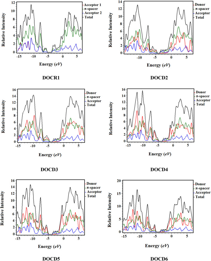 Density of states diagrams of DOCR1 and DOCD2–DOCD6 at M06/6-311G(d,p) level. Figure was drawn by utilizing PyMOlyze 1.1 version and output files were computed through Gaussian 09 version D.01.